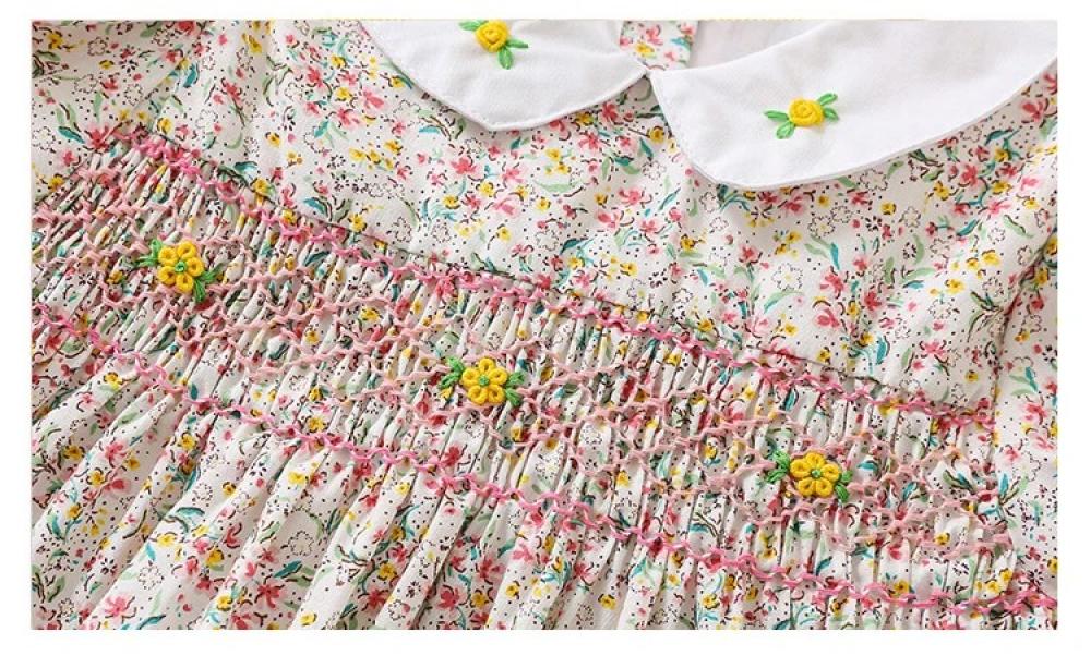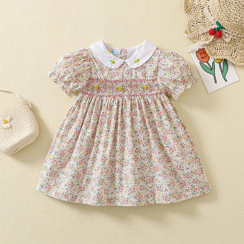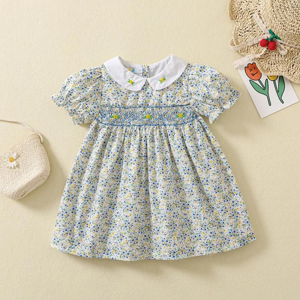فستان نقش زهور بأكمام قصيرة، مصنوع يدويًا مع تطريز إسباني صيفي